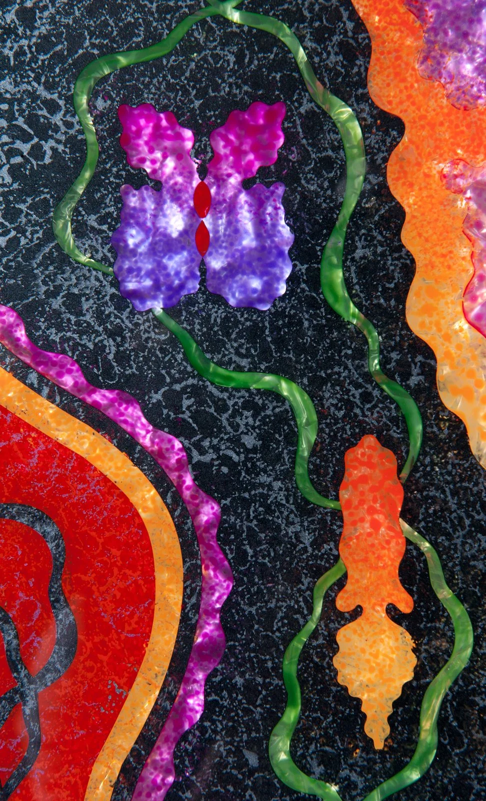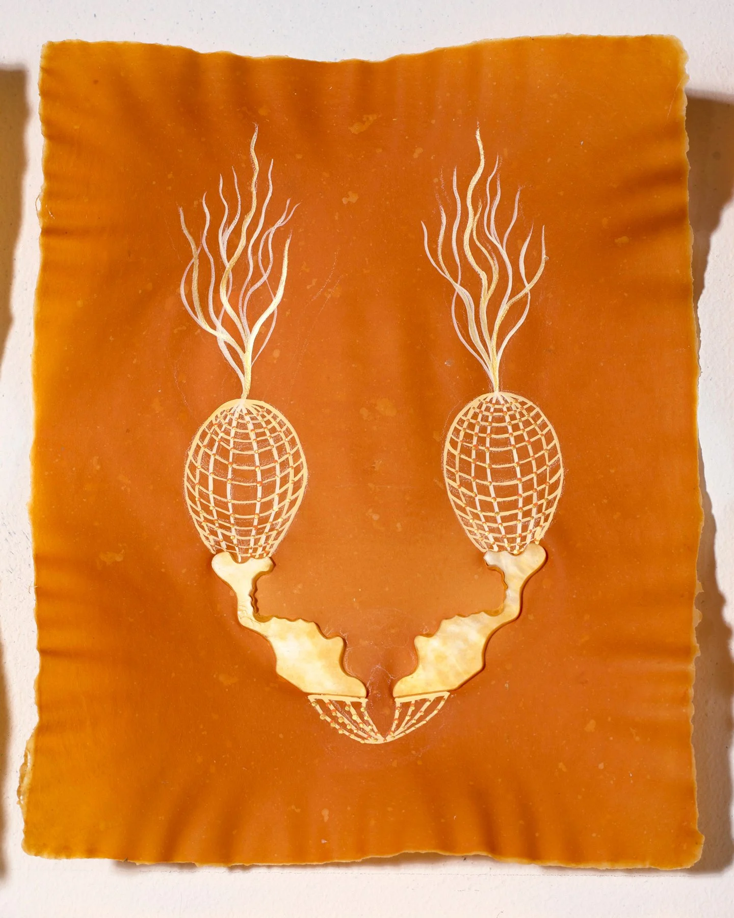 In Land of Milk and Honey: Stuck, Samour cuts acrylic Mother of Pearl into the shapes of Israel, the Palestinian territories, and encroaching settlements. The cartographic shapes are then mirrored and embedded into sheets of over-beaten Abaca paper pulp that has been pigmented to elicit honey. The various territories are treated as biological specimens, creating a tension between stasis and potentiality, the search for the promised land; the land of ‘milk and honey’. This re-examination of land as a malleable, movable, biological and political construct forms a visual vocabulary suggestive of Habitat Fragmentation (the effects of geographic fragmentation on biologic diversity); flagella (the means of movement for microscopic organisms); plant metamorphosis; root structures; and cell division.