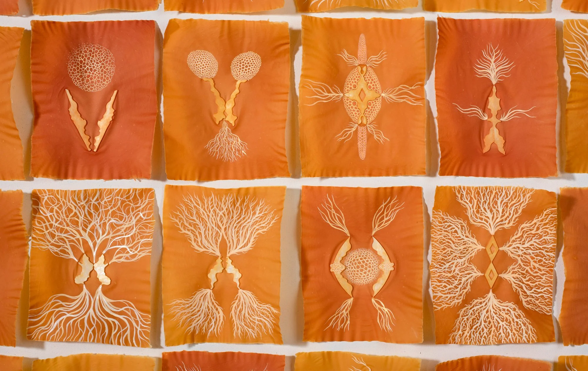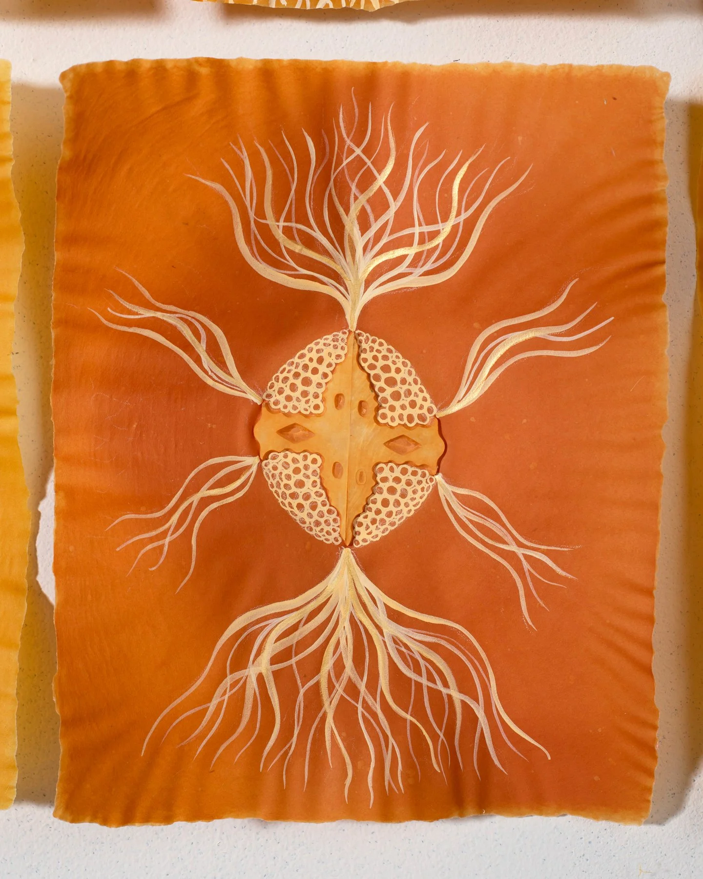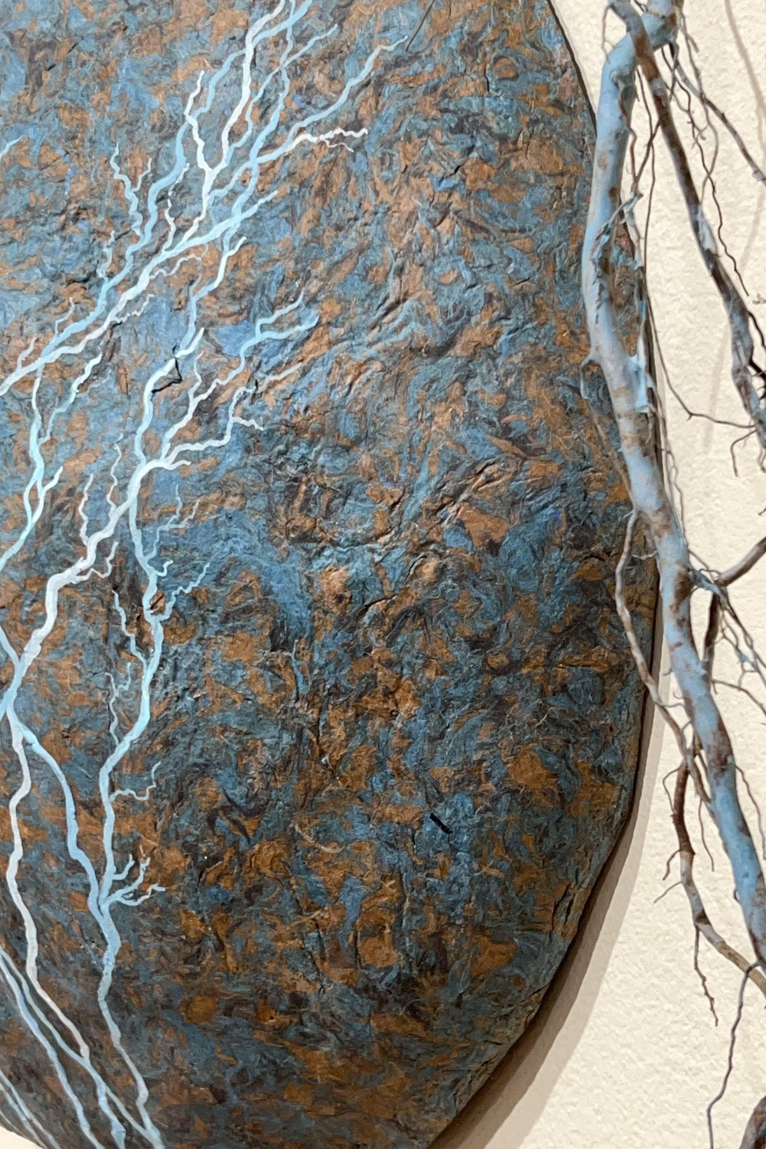 Cast pigmented gampi and abaca fiber, tree roots, gouache