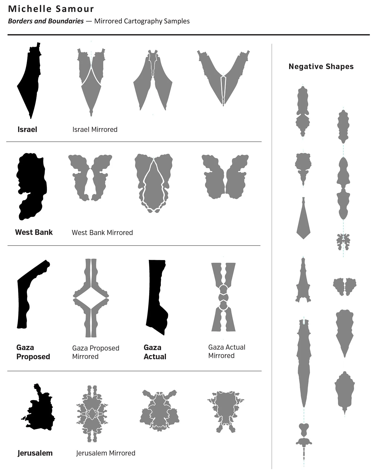 Borders and Boundaries is a series of works in which artist Michelle Samour appeals to her ancestral past as a means of further engaging in the politico-geographic concepts of homeland, exile, and diaspora. Through cartographical repetition and reflections, Samour maps the historical (dis)possession of Palestine, ultimately decimating borders, boundaries and territorial constructs into geometric abstraction.
