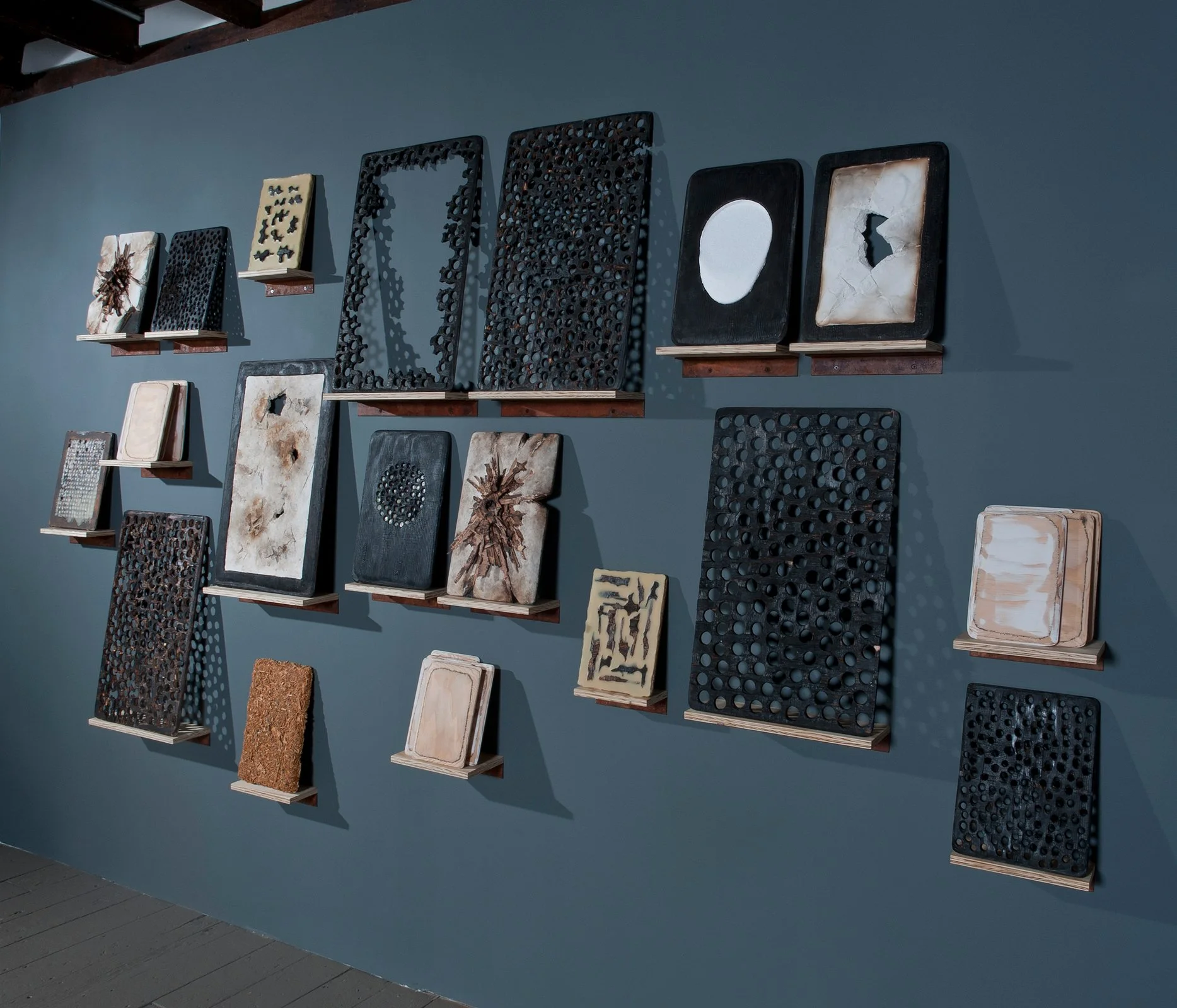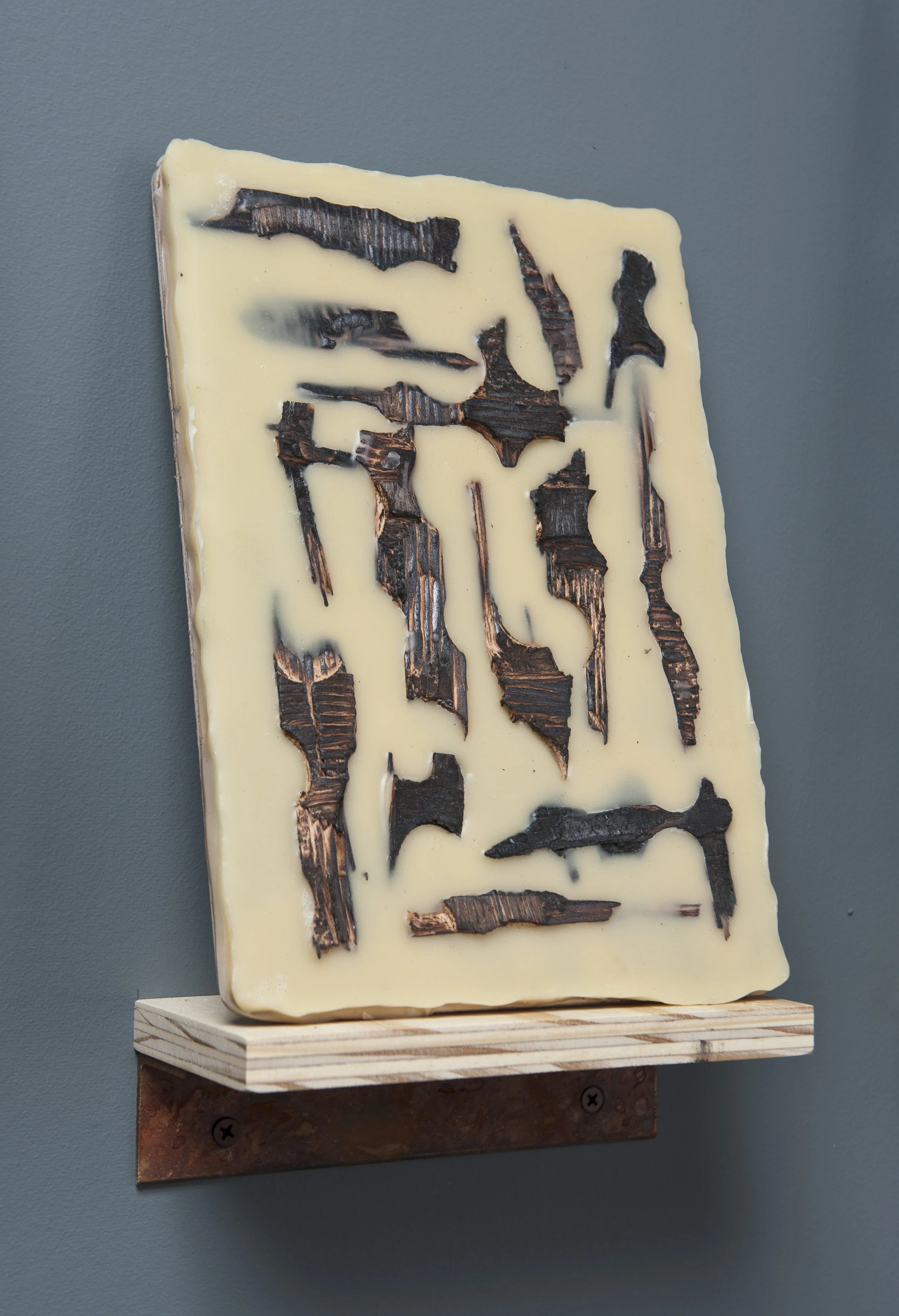 Drilling holes in wooden tablets and then burning them was the starting point of this piece and a way of speaking about the loss and destruction of the Palestinian's homeland. Collecting the scraps of wood that resulted and embedding them into plaster and beeswax (milk and honey), mirrors the cyclical nature and closed system of the Palestinian story where leaving is difficult and staying can be even more so.