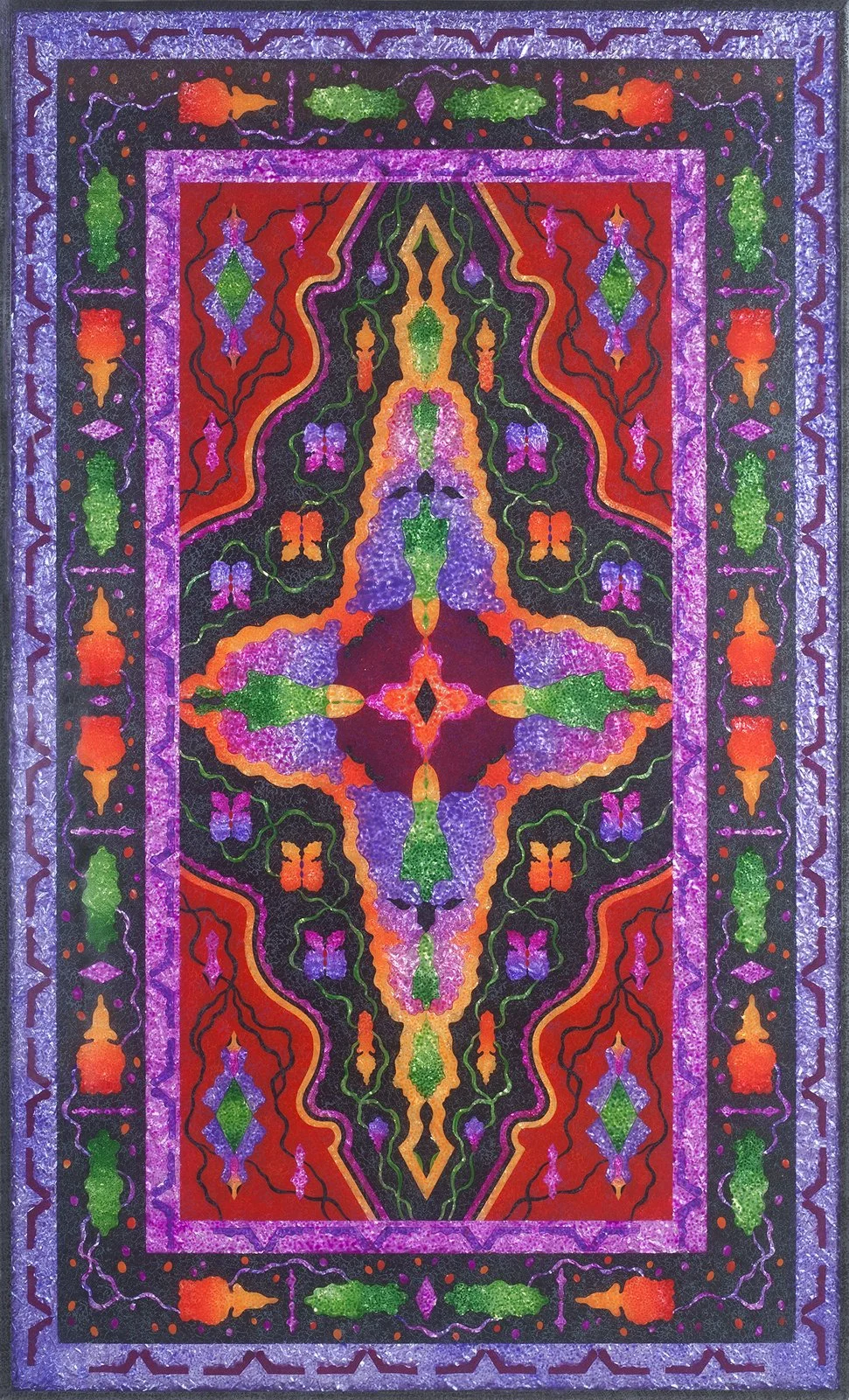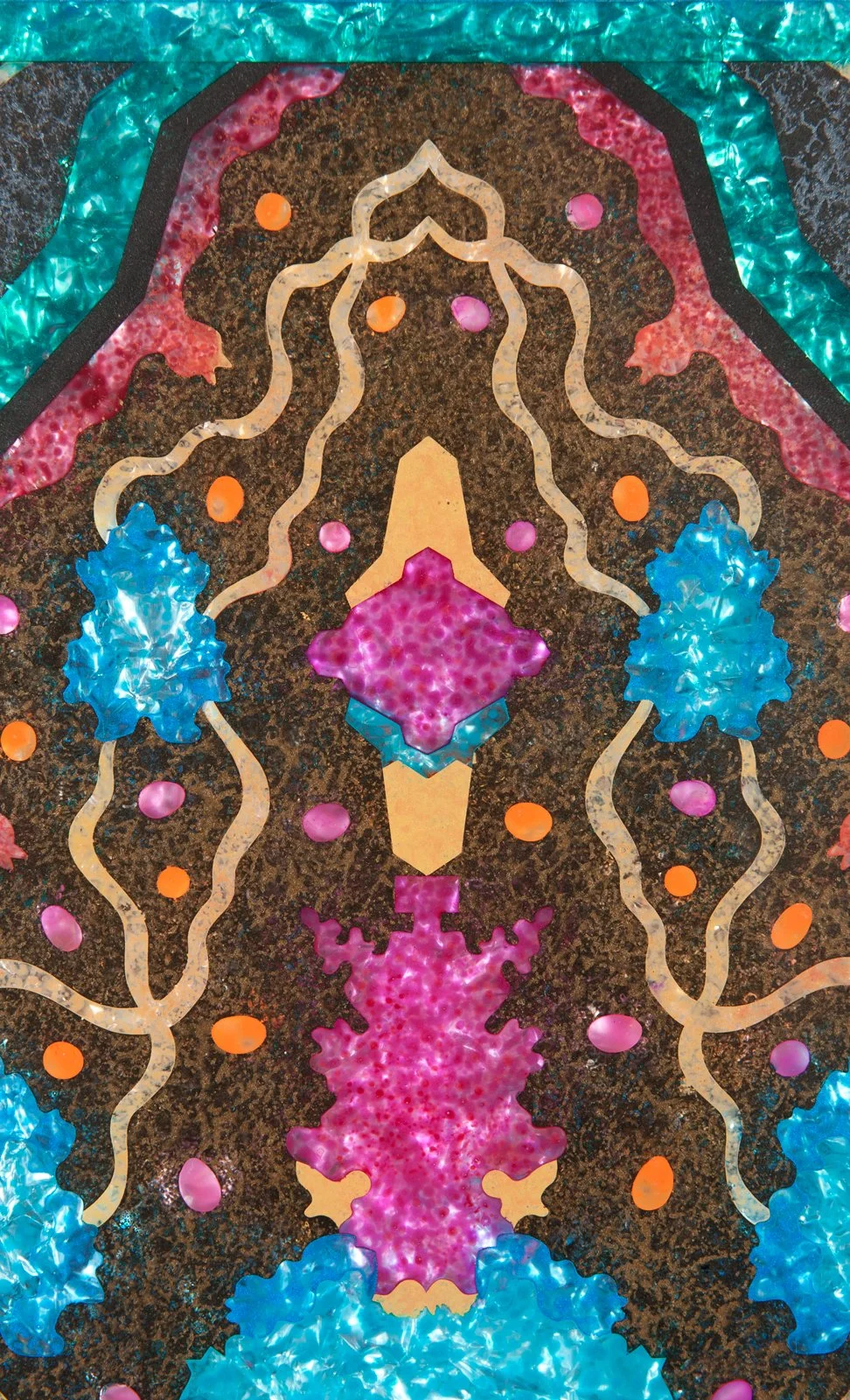 Ostensibly decorative, the work critically investigates the meaning of shape/land/form within the guise of traditional Palestinian craft. Samour’s pallet references the vibrant colors from Palestinian embroidery and weaving, while the materials emulate the depth and luster of Mother-of-Pearl carving prevalent in Bethlehem. Samour employs the tropes of optical illusion and opacity to present the viewer with a dizzying cartographic narrative of political geography.