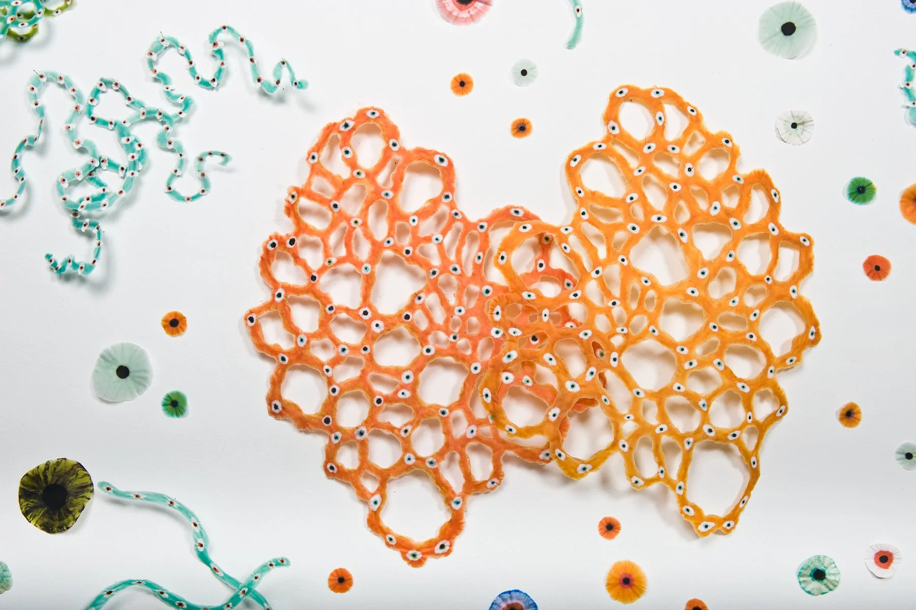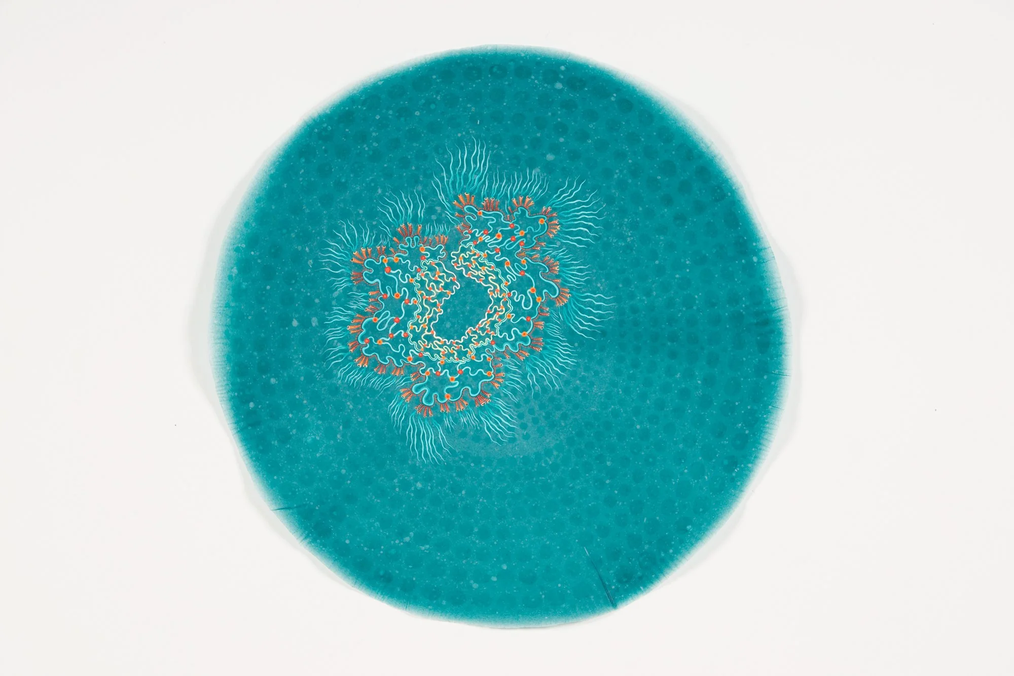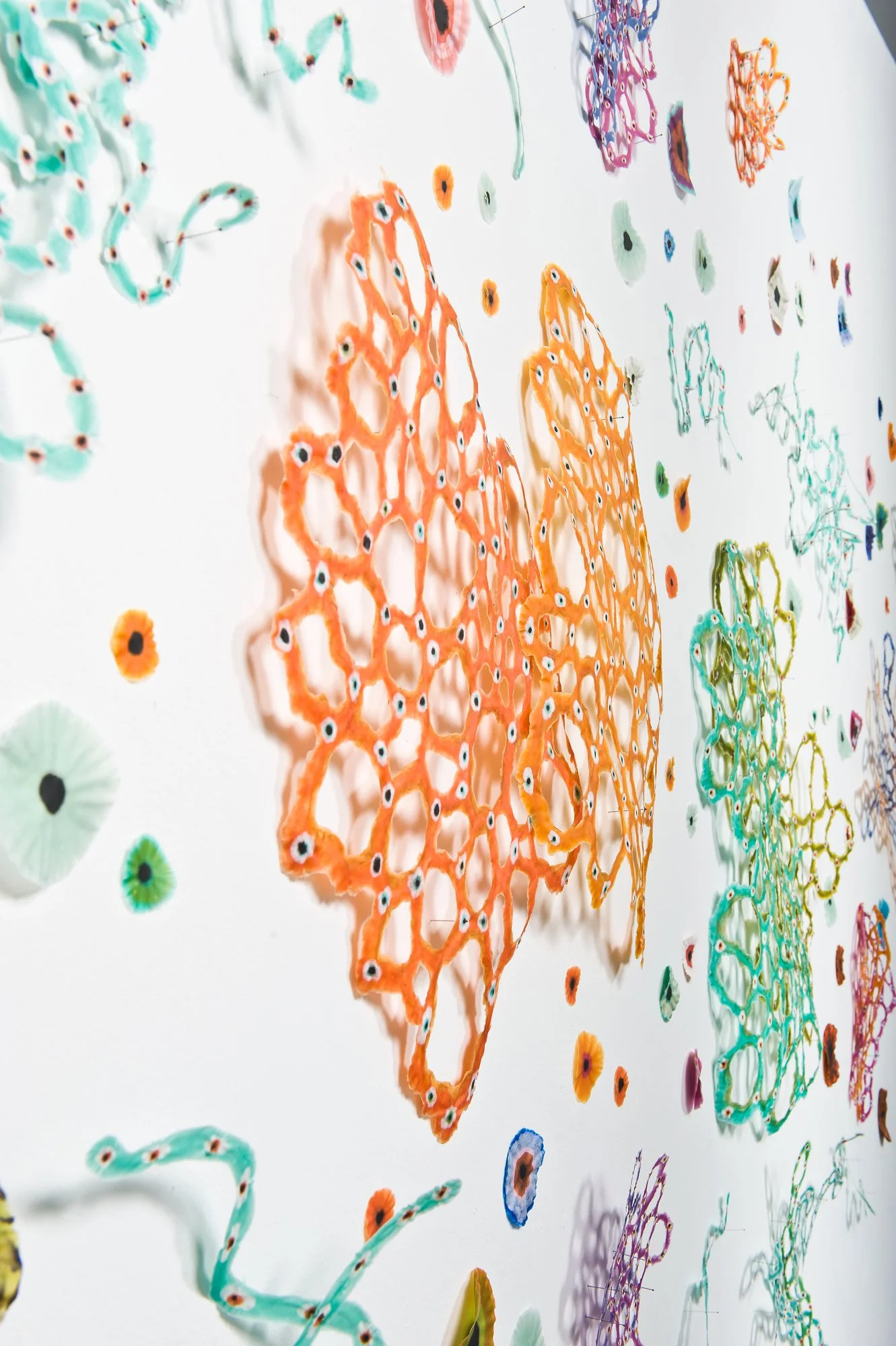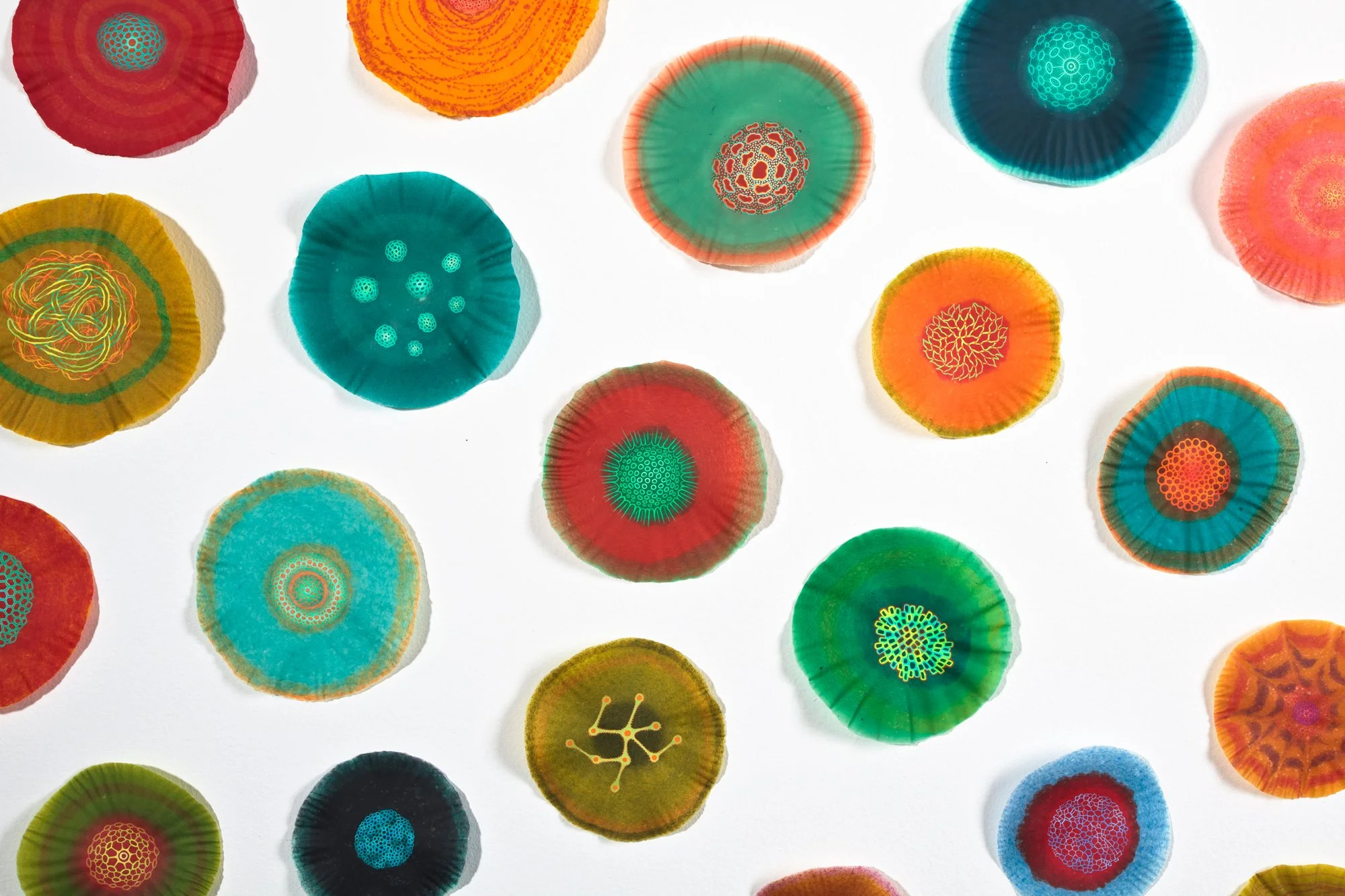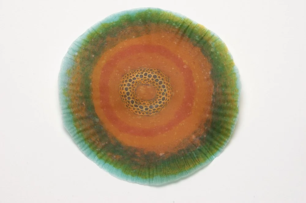 In this series, the use of finely processed and pigmented plant fiber creates an organic, translucent and transitory context for investigating the relationship between science, technology and the natural world. The circle becomes a symbol of the ‘all knowing eye,’ the eye of the telescope and microscope, and the physiological eye—our first lens to the visual world. Clusters of ‘cells’, (biologic, geometric, technologic and social) are held together by their close proximity to one another and float on their surfaces, momentarily captured for further investigation. They reference everything from neurons, killer viruses, microscopic radiolarian, the interchange of data by packet switching in Internet communications, to links of fiber-optic cables and wireless connections. The organic becomes over-laid and interchangeable with the technological.