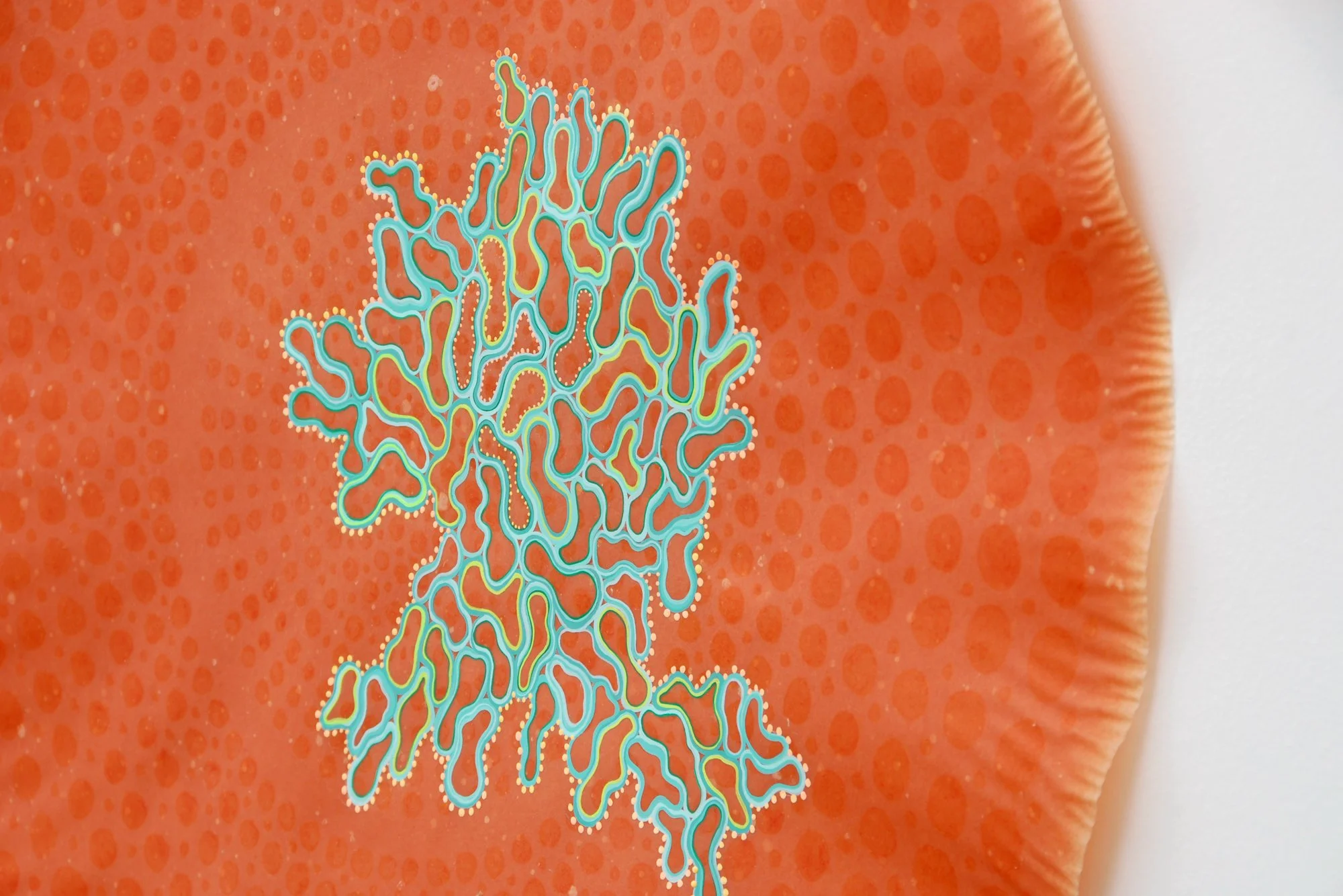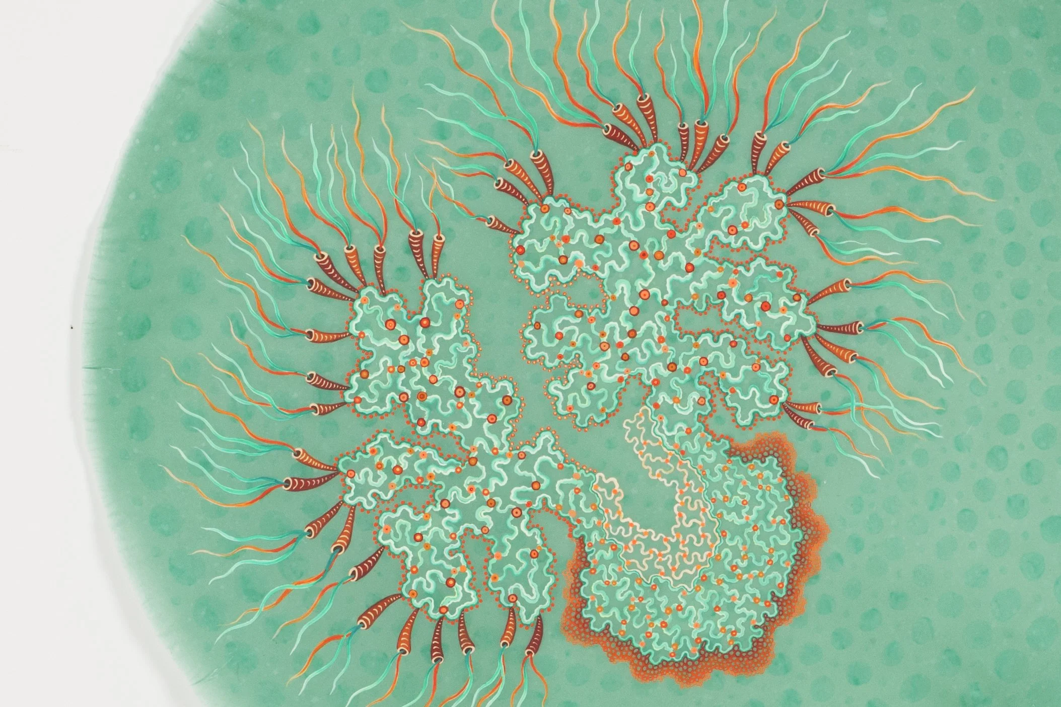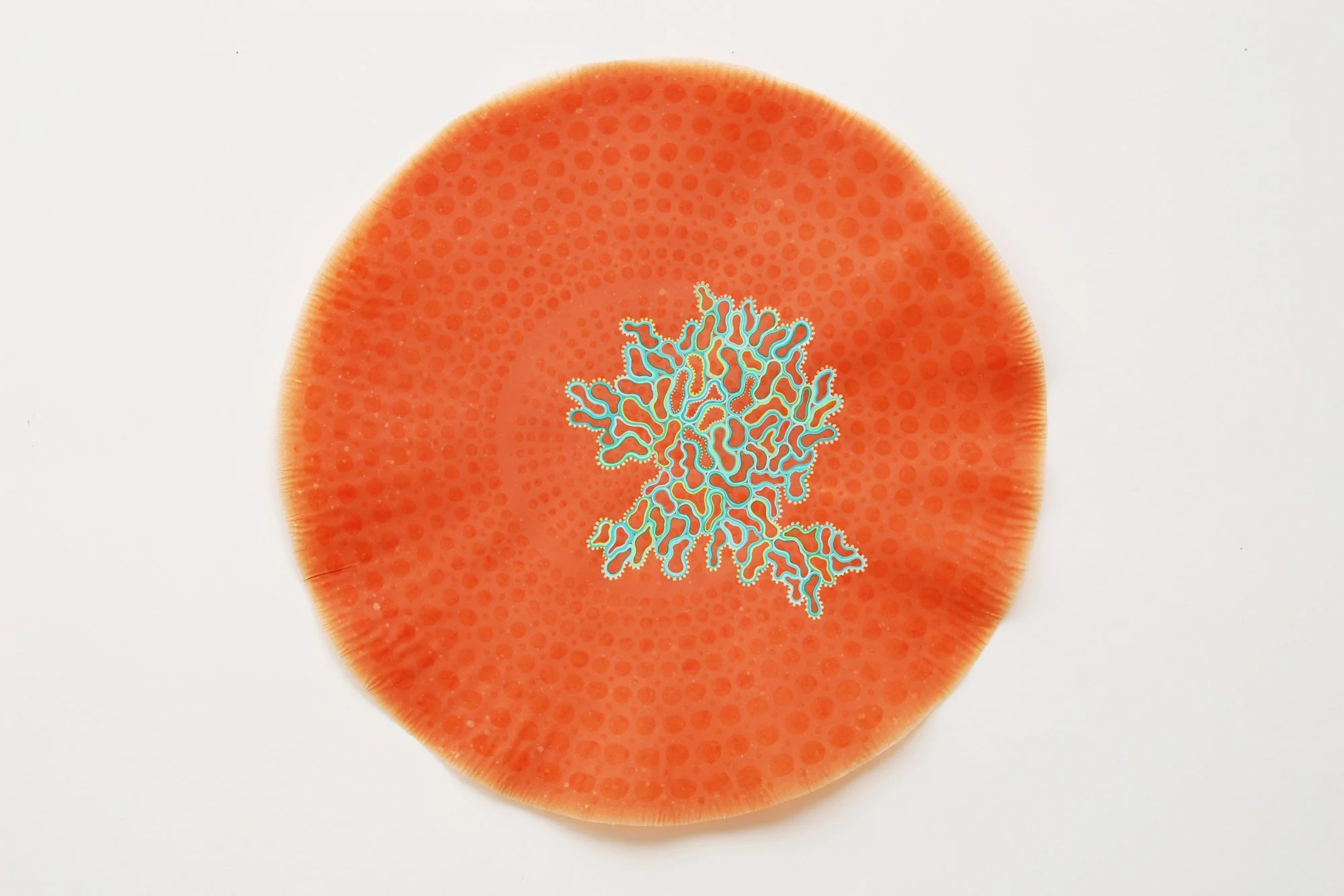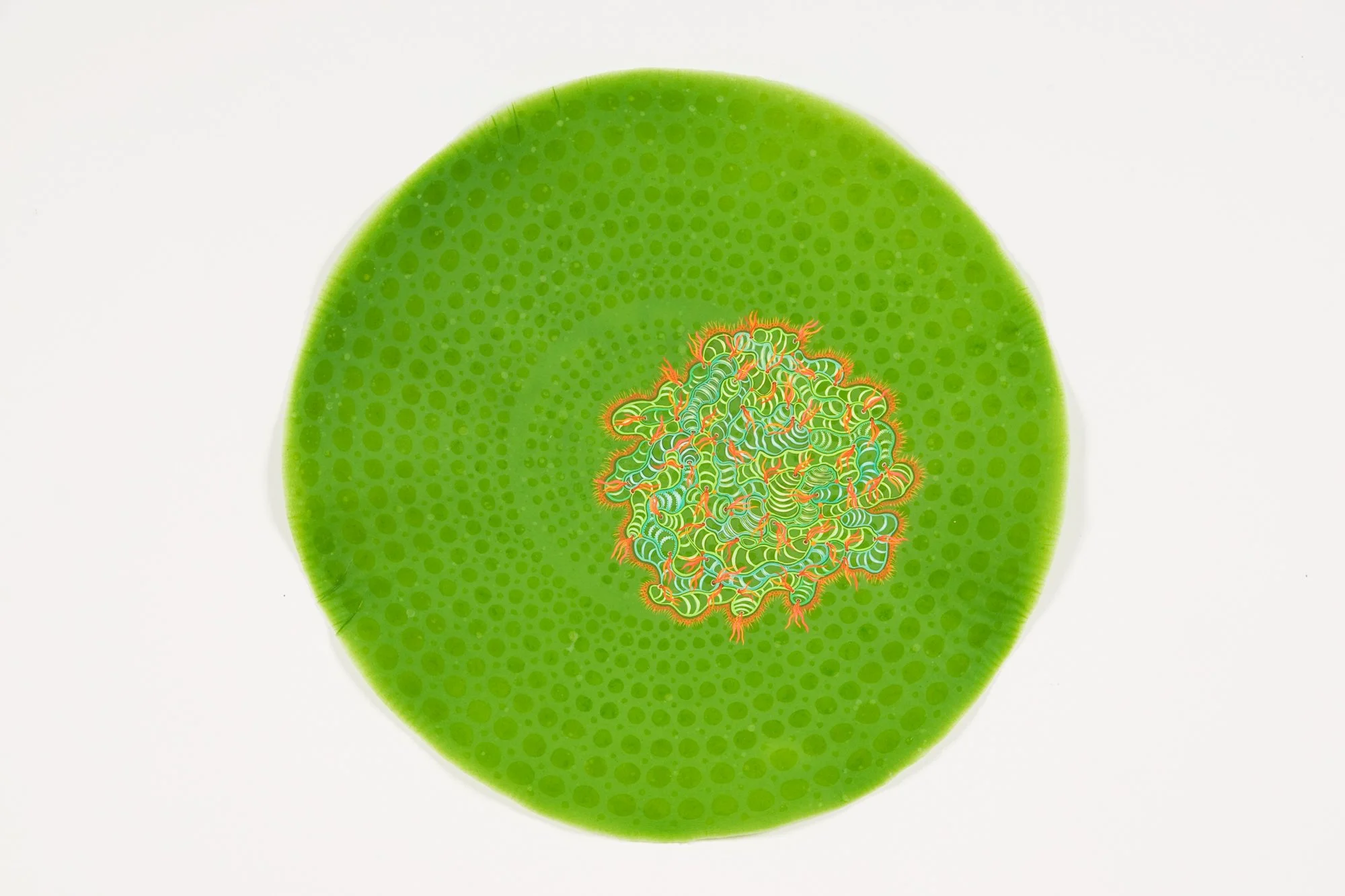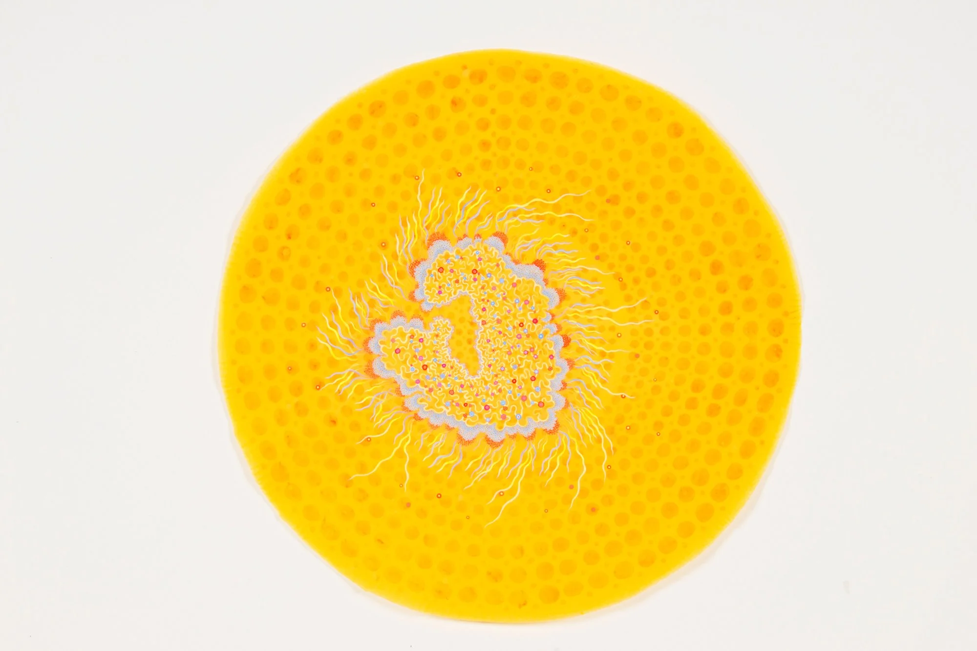In this series, the use of finely processed and pigmented plant fiber creates an organic, translucent and transitory context for investigating the relationship between science, technology and the natural world. The circle becomes a symbol of the ‘all knowing eye,’ the eye of the telescope and microscope, and the physiological eye—our first lens to the visual world. Clusters of ‘cells’, (biologic, geometric, technologic and social) are held together by their close proximity to one another and float on their surfaces, momentarily captured for further investigation. They reference everything from neurons, killer viruses, microscopic radiolarian, the interchange of data by packet switching in Internet communications, to links of fiber-optic cables and wireless connections. The organic becomes over-laid and interchangeable with the technological.